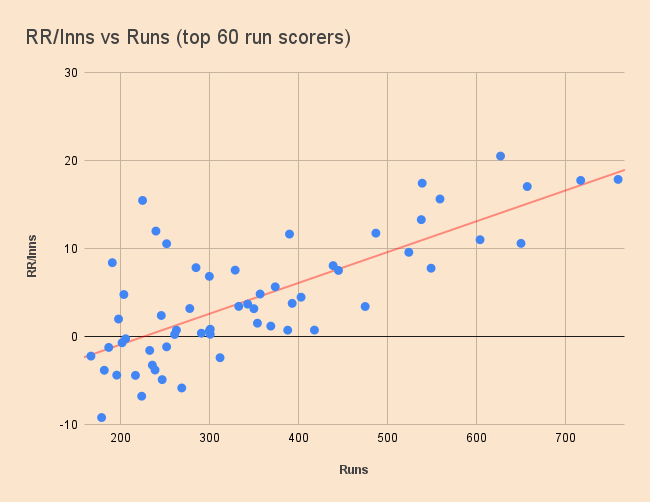 Looking at the chart, the top 60 batters cluster into groups – those who scored over 500 runs, between 300 and 500, and under 300. Think of this as your run scorers being in an exceptional group, above average and decent. 300 runs is about the point where batters all go into the positive in terms of RR/Inns, hence the use of ‘above average’.