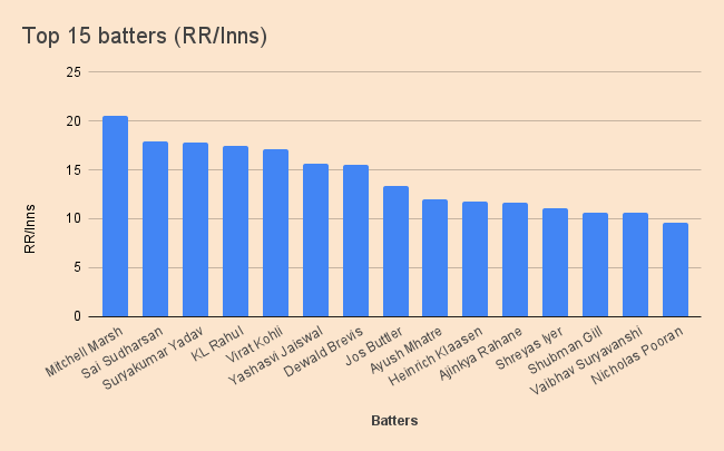 Other standout players include the top run scorers (Sudharsan, SKY & Kohli) and, more interestingly, KL Rahul. These five (including Marsh) were the only batters to score over 17 RR/Inns. Marsh is in a league of his own, though, at 20.54.
