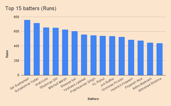 Sai Sudharsan (759; 54.21; 156.17), Suryakumar Yadav, (717; 65.18; 167.91), Virat Kohli (657; 54.74; 144.71), Shubman Gill (650; 50.00; 155.87), Mitchell Marsh (627; 48.23; 163.70), Shreyas Iyer (604; 50.33; 175.07), Yashasvi Jaiswal (559; 43.00; 159.71), Prabhsimran Singh (549; 32.29; 160.52), KL Rahul (539; 53.90; 149.72), Jos Buttler (538; 59.77; 163.03), Nicholas Pooran (524; 43.66; 196.25), Heinrich Klaasen (487; 44.27; 172.69), Priyansh Arya (475, 27.94, 179.24), Aiden Markram (445; 34.23; 148.82), Abhishek Sharma (439; 33.76; 193.39).